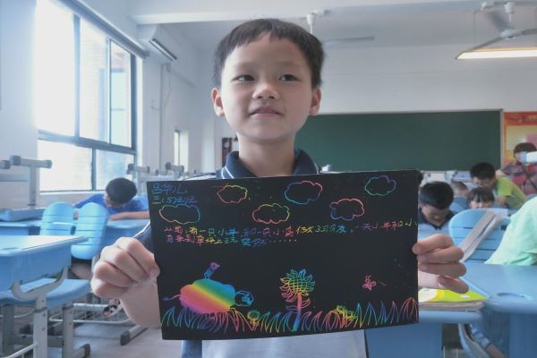 开始上课后,邓思佳要求同学们先进行自我介绍,增进了同学与老师以及同学之间的感情。接着,邓思佳正式介绍此次课程“蜡笔牙签画”。邓思佳提出了“最喜欢的小动物”和“我眼中的尚宇中学”两个话题让同学们讨论,同学们发表了自己的想法和观点。讨论结束,同学们充分发挥想象力,用彩色蜡笔在画纸上画出了自己最喜欢的小动物或者自己眼中的尚宇中学,然后在邓思佳的指导下用黑色蜡笔和牙签进一步完善自己的画作。