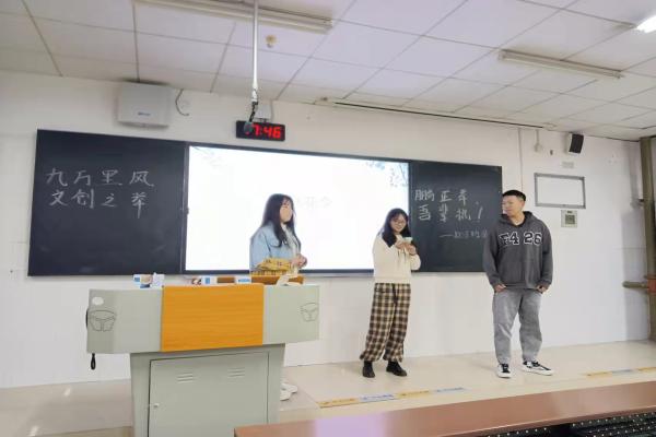 活动开始,朱文琪由“由人化文,以文化人”的含义切入主题,介绍了辉煌的中国文创历史,并阐述了新一代青年挑起文创之责的重要性和必要性,同时给同学们介绍了校园里的文创组织,让同学们了解了参与文创的途径。特色活动环节,为了让同学们切身感受中国文创的美,朱文琪安排了“飞花令”,同学们积极参与其中,进一步体会到了文创的美。活动接近尾声,同学们积极发表心得体会,班长赵一阳进活动总结,活动正式结束。