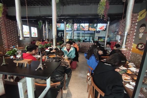 部分班委提前前往阜埠河上玖烤肉店预定座位,并等待同学们的到来。12时整准时开始聚餐活动,班级同学分组分桌进行聚餐活动,现场气氛活跃。