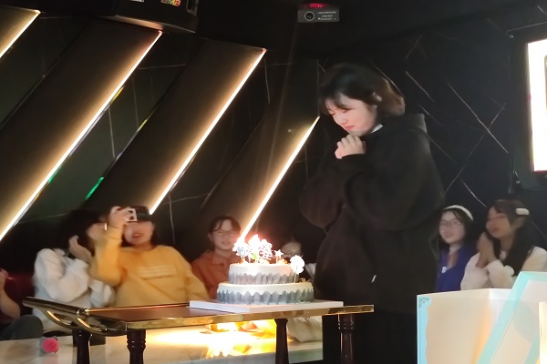 在用餐之后前往渔湾码头时尚广场维度KTV进行另一个活动,班长代表班级女生对男生送上节日祝福。