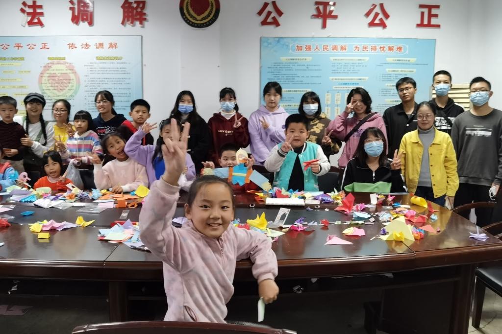 活动伊始,各志愿者到达岳南村社区会议室,对场地进行了布置,设备进行了调试。在小朋友到来之后,由孙一鑫同学主持,各志愿者和小朋友们玩了几个小游戏:抱成团、虎克船长、抓鸭子。随后,各志愿者协助小朋友们一起完成了各种各样的折纸,如:千纸鹤、坦克、蝴蝶。在活动的最后,志愿者和小朋友们都分享了这次折纸活动的感受并拍照留念。
