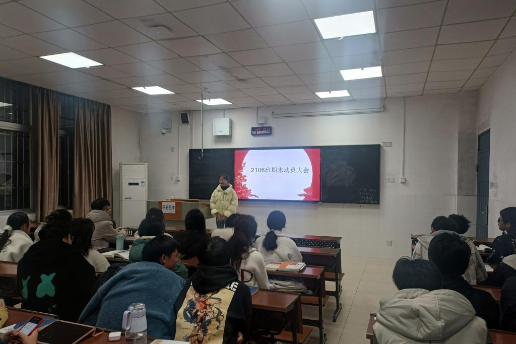 (通讯员 周胤宏)12月19日18时30分,2106班团支部于至善楼104教室举行期末考试动员大会活动。本次活动由2106班班长郭路主持进行。出席此次会议的有2106班班导师邓国博及2106班班导朱芸菲。