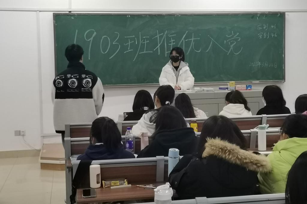 此次会议由团支书张淑雯主持进行,党支部成员张鹤馨担任此次会议的监察员。七名候选人依次上台发言,在接受预备党员的提问后由全体成员进行投票。投票结果表明,七名候选人均获得推优机会,他们分别是:谢明珊、蒋程、何婧茹、李育霖、李锐、邵树林、卡得尔亚•艾尼。