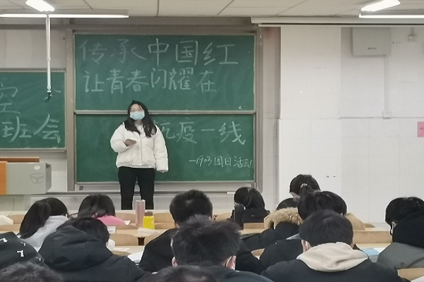 活动中,宋周华向全班同学讲述疫情期间的注意事项,如随时随地佩戴口罩、未经允许不准出校等,强调了长沙确诊病例的活动轨迹以及长沙疫情防控区、管控区、防范区的范围。团支书张淑雯也为同学们分享了疫情期间的典型事例,如大雪中哭着也要把物资送达的“大白”等。