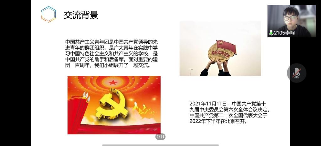此次团课刘毅作为主持人,继主持人致开场词后,依次由2105至2107班以及21浩青班和社团小组围绕团课主题进行了小组学习成果展示。小组展示通过PPT演示、视频剪辑、演讲等方式进行,分享了各组学习成果,书写了中国青年运动的华章,展示了最积极最有生气的力量。