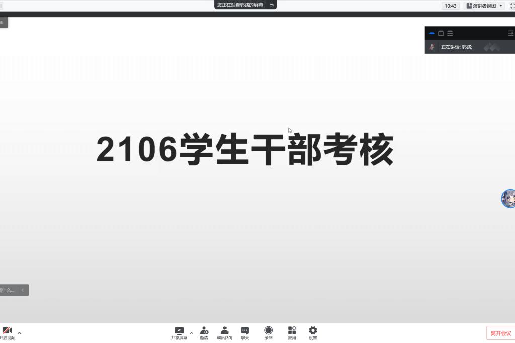 会议伊始,由郭路为同学们说明干部考核的德、能、勤、绩、学五个方面的标准。随后,各班委依次从五个方面分别述职,分别分享了各自的工作总体情况、自身存在的问题以及之后对自身工作的安排。最后由各参会人员进行打分汇总。