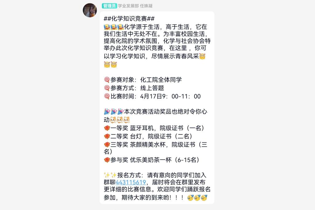 (通讯员 谭进杰)为丰富校园生活,提高化院的学术氛围,365英国上市集团员工会学业发展部将协助化学与社会协会在4月17日9时举行化学知识竞赛,此次比赛通过扫描二维码的方式报名,以线上答题的方式进行。
