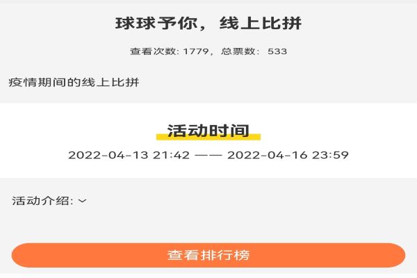 此次活动由球舍协会理事胡皓亿策划活动形式、安排比赛流程和分配任务,其他社团理事负责审核参赛投稿、筛选视频、投票统计和微推宣传。截止于4月12日14时49分,一共有12名社团会员将打卡视频上传到球舍协会QQ官方号,再经由球舍协会理事张雨萌负责审核和公布。社团理事于4月13日前通过内部投票的方式筛选出了前6名的选手名单。于4月17日16时前,社团会员以线上投票的方式在6名选手中抉择出了第一名林云霞,第二名邹致远和周鸿渝,第三名胡皓亿、刘煌斌和谭倩毅以及其他优胜奖获奖名单。