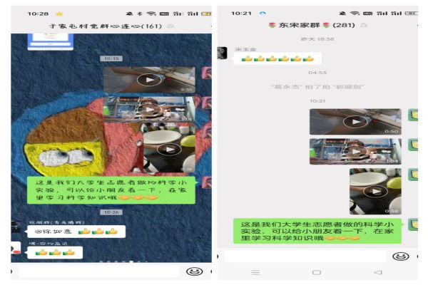 此次志愿活动旨在传播生活中的化学知识,以拍摄视频,讲解化学原理的形式向社区的小朋友们宣传科学知识。此次志愿活动以寝室为单位开展,由寝室长带领志愿者们拍摄视频,由青年志愿者委员联系社区工作人员发布到社区群内进行宣传,志愿者们通过“隐形的墨水”、“杯中彩虹”等小实验,向小朋友们展示了化学的奥妙。