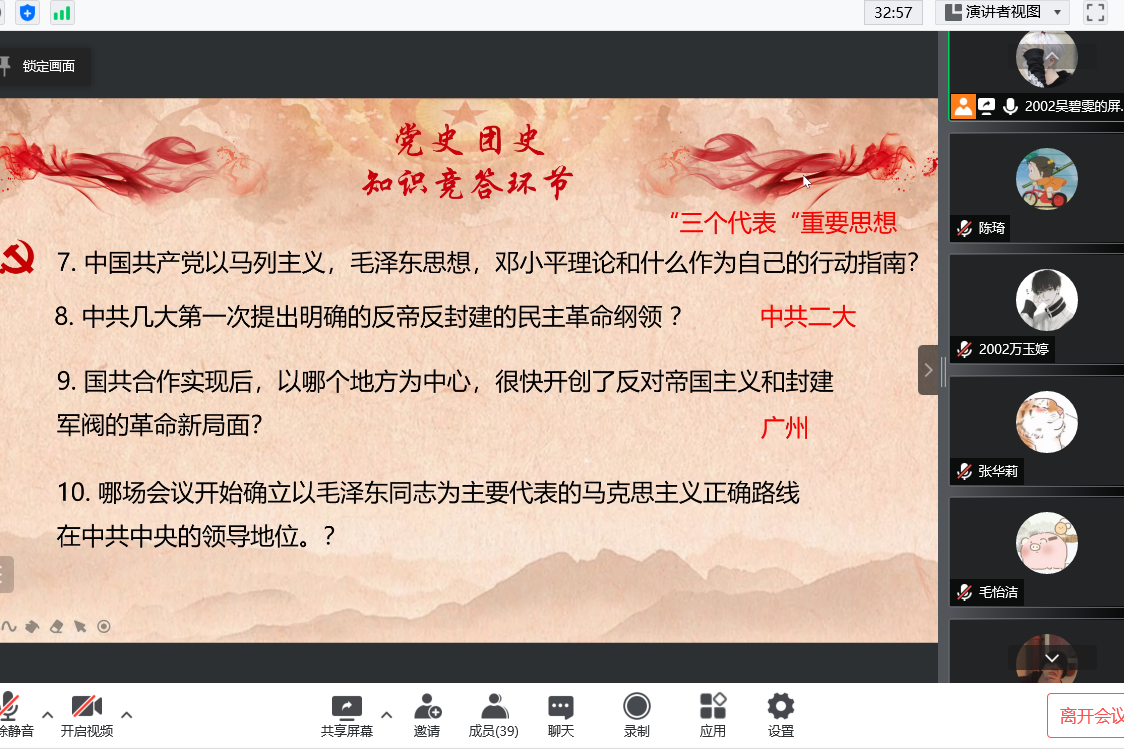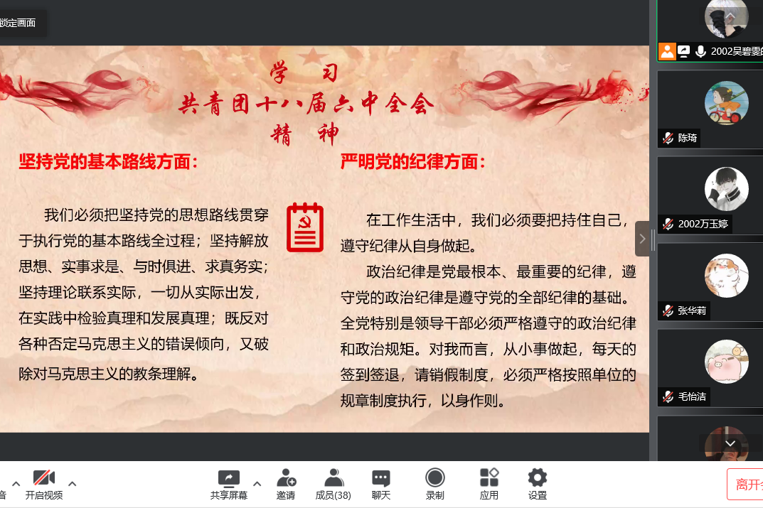 (通讯员 陈琦)2022年4月30日19时00分,2002班借助腾讯会议平台开展了线上春季理论创新活动。