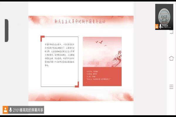 (通讯员 邱璇)4月28日下午21时整,2101班通过线上会议的方式举办了春季理论活动,此次活动由宣传委员罗雅文主持。