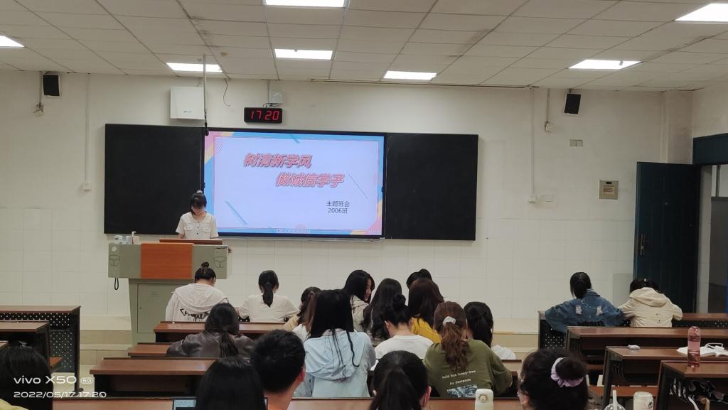 (通讯员 袁雅琦)5月17日下午,在至善楼105教室,2006班举行“树清新学风,做诚信学子”主题班会,会议由2006班生活委员蒙小娜主持。