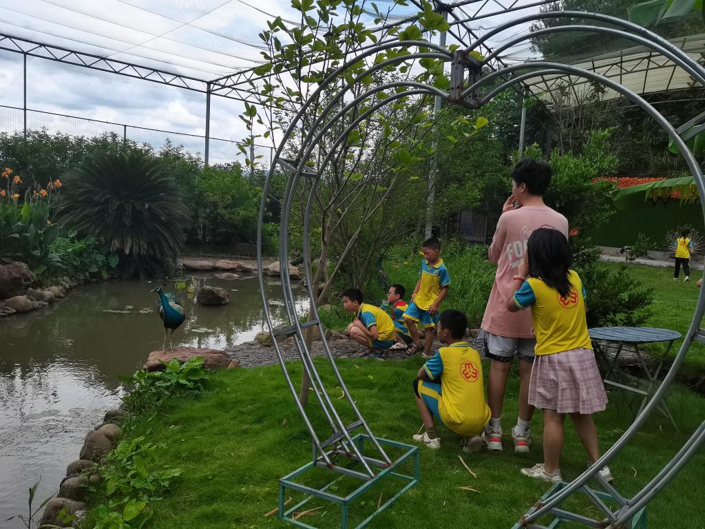 孩子们在度假村工作人员的带领下向前来到动物园参观,大家看到了许多鸟笼,鸟笼里有各种各样的鸟在啼叫。接着来到了孔雀园,大家看到了几只长势不同的孔雀,在园长的提示下,小朋友们近距离观察孔雀、拾起孔雀的羽毛留作纪念。由于天气突变,下起暴雨,大家躲进了科普标本馆,看到了蝴蝶标本和各种多肉植物。科普标本馆的工作人员向孩子们介绍各种多肉的名字以及不同种类蝴蝶的特点。中午孩子们和志愿者老师们以及苦志育才公司各位老师们共进农家饭。
