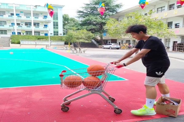 文娱组组长金阳为运动会设计了多种方案用以应对炎热的天气而发生的特殊情况,同时,为参与的工作人员进行工作分配,宣传组负责对每一个运动项目开展进行摄影与拍照;生活组负责准备相关药品,准备以及分发水,在每一个运动区域安排人以应对突发情况;调研组、教学组根据各个运动项目的情况安排工作人员值守并配合文娱组现场维持秩序。在会前相关工作分配到位后,各个成员进行道具、器材的搬运以及场地的划分,针对运动会各种项目,工作人员准备了篮球、羽毛球、乒乓球,同时,为了宣传绿色环保理念,我们将废报纸以及混沙用来制作需要的沙包。