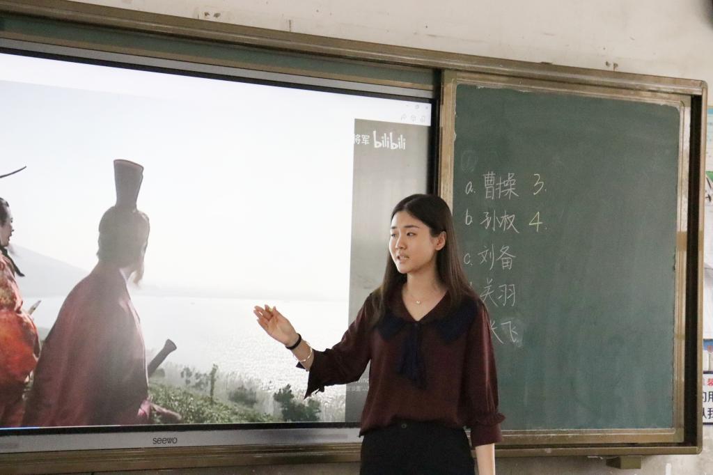 教学过程从三国形成的基础,三国著名事件和三国主要人物三个方面来开展。谢培琳首先从讲解东汉末年朝廷腐败无能导致张角率领黄巾军进行“黄巾起义”入手,接着进入本次课程两个重点内容的讲解:第一个重点教学内容是三国时期的主要人物,谢培琳利用视频让同学们了解人物的性格特点,并让同学们将人物与其性格匹配;第二个重点教学内容是三国时期的著名事件,重点讲解了赤壁之战、彝陵之战和官渡之战,介绍了三大战役的过程和其中出现的人物。在本次课程最后,谢培琳让同学们写下“如果穿越回三国时期,他们想要成为那个人或物”,并请几位同学分享他们的想法。
