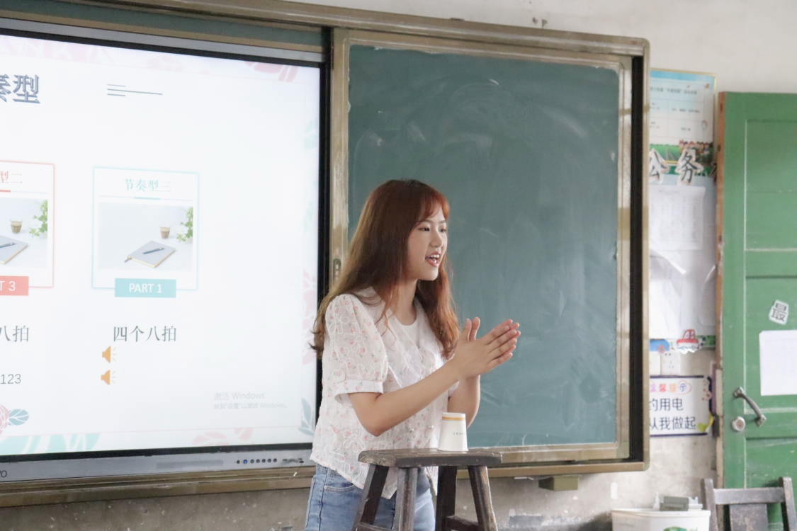 杯子舞趣味课程以《稻香》为背景音乐,共分为三种节奏型。课堂伊始,郑丹霞以“纸杯有什么用途”为引进行提问,介绍了纸杯能作为打击乐器,演绎出杯子舞。在此基础上,郑丹霞示范演示三种节拍型的杯子舞,并且让同学们跟堂练习。在教学课程中,郑丹霞通过图片、音频、视频等形式,将同学们代入《稻香》的音乐美之中,发掘了更多的音乐细胞。
