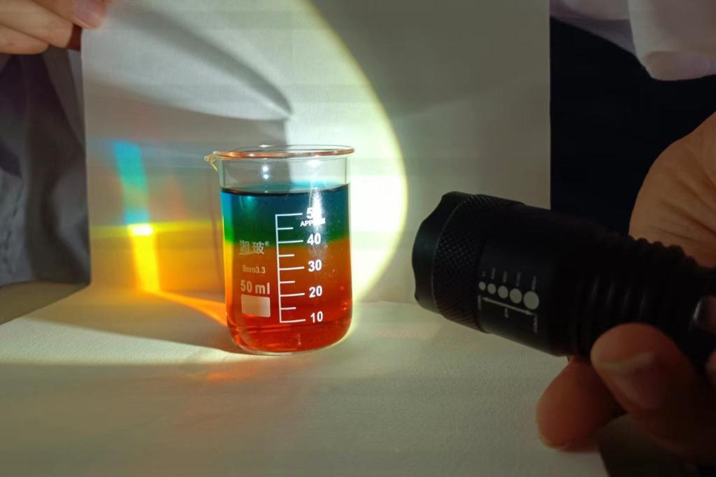 第二个实验“密度彩虹”,唐继彧分别向有红色,黄色,蓝色水的杯中依次加入8勺盐,4勺盐和2勺盐。再用滴管分别将红黄蓝三色水加入到烧杯中,之后出现明显的分层。用手电筒照射,映在白纸上,就出现了“彩虹”。演示结束后,唐继彧安排同学们自己动手实验,员工们的作品都五彩斑斓。
