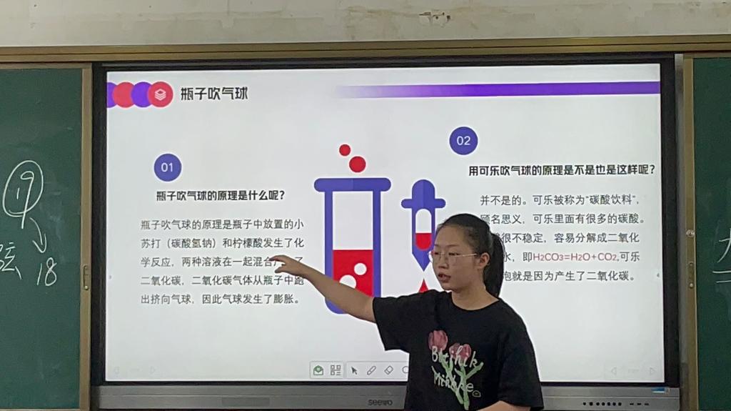 余思宇选取了四个生活中的化学事例:瓶子吹气球、溶洞形成、自热火锅、水垢。余思宇首先提出问题“瓶子怎么能吹气球呢”引发同学们的思考和激烈的讨论,通过一段视频,引出了瓶子吹气球的原理。还将家中可用来制作瓶子吹气球实验的原料告知同学们,并鼓励他们自己动手尝试。接着通过展示安化县马路镇特色景点龙泉洞的照片,余思宇引入溶洞,并教授员工溶洞的形成过程,让同学们对家乡美景的形成有了进一步认识。
