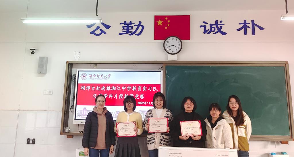 正式比赛前,各个选手抽签决定上场次序。9名实习老师依次上场,每位实习老师展示8分钟的片段教学。参赛教师们认真钻研教材,精心设计教案,反复磨课、研课、调整,以新颖的教学设计、巧妙的引导,将各自的教学风格和教学水平发挥得淋漓尽致,充分展示了化工院实习教师良好的精神面貌和扎实的专业素养。赛后,邓敏对9名选手的表现进行了细致专业地点评和总结,在教学方法、细节处理以及专业素养等各方面提出了中肯的建议和指导。曾佑林当场宣布获奖情况,南雅湘江中学化学组三位教师颁发各个奖项。