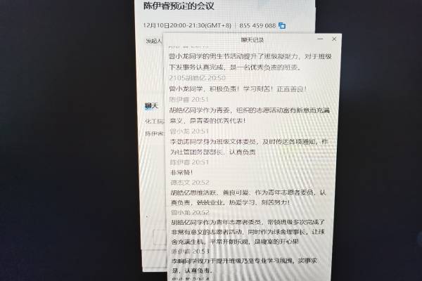 会议伊始,陈伊睿简要介绍了会议的主要内容,各团员发言顺序以及会议的相关纪律等有关事宜。会议开始后各位团员依次根据自己在2022年的表现和发挥团员作用的情况等发表个人总结陈述。其余同学在聊天框内对发言人进行评价,指出不足并提出建议。会议结束后以2105团支部为单位在班级群内对所有团员进行民主测评投票,支部委员会再以测评结果为基础,结合个人表现评选出优秀团员名单,并以此激励所有同学再接再厉。