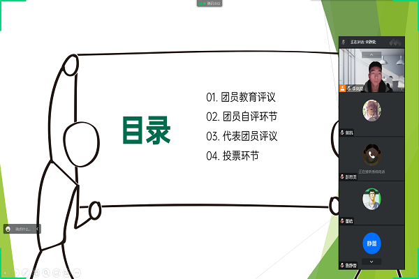 (通讯员 李岚彪)2022年12月13日15时2207班团支部在线上召开了关于团员教育评议的团小组会议,2207班所有团员都参与了此次活动,此次会议主要分为四个部分,旨在给每名团员进行年度评议,团支书李岚彪介绍了团员教育评议制度的内容以及影响,会上每名团员进行了自我评议,阐述了自己的学习成果并深刻地认识到了自己身上所存在的问题,团支书李岚彪对团员们的评议进行了评价,对团员们本学期的表现进行了点评,代表团员也从优缺点两方面对团员们的自述进行了评价,随后李岚彪发起投票,综合团员们的个人自述,代表团员的评议以及投票结果,2207班团支部初筛出了9名优秀团员以及23名合格团员,亟待支部委员会进一步决定最终的优秀团员。
