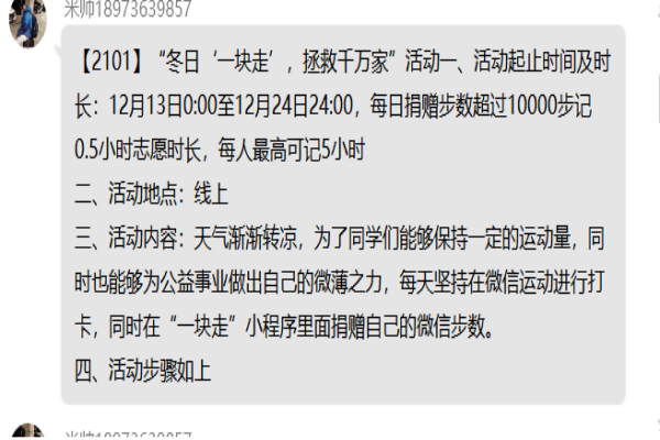 本次活动分为两个阶段。第一阶段是由青委米帅主持线上会议进行讲解,带领大家熟悉本次志愿活动的流程和内容;第二阶段是同学们按照安排通过每天坚持运动,线上公益捐赠步数并按时上传截图的方式,协助青委完成每日统计。通过此次活动,同学们锻炼了身体,丰富了寒假居家生活,同时还为社会公益事业做出了一份贡献。