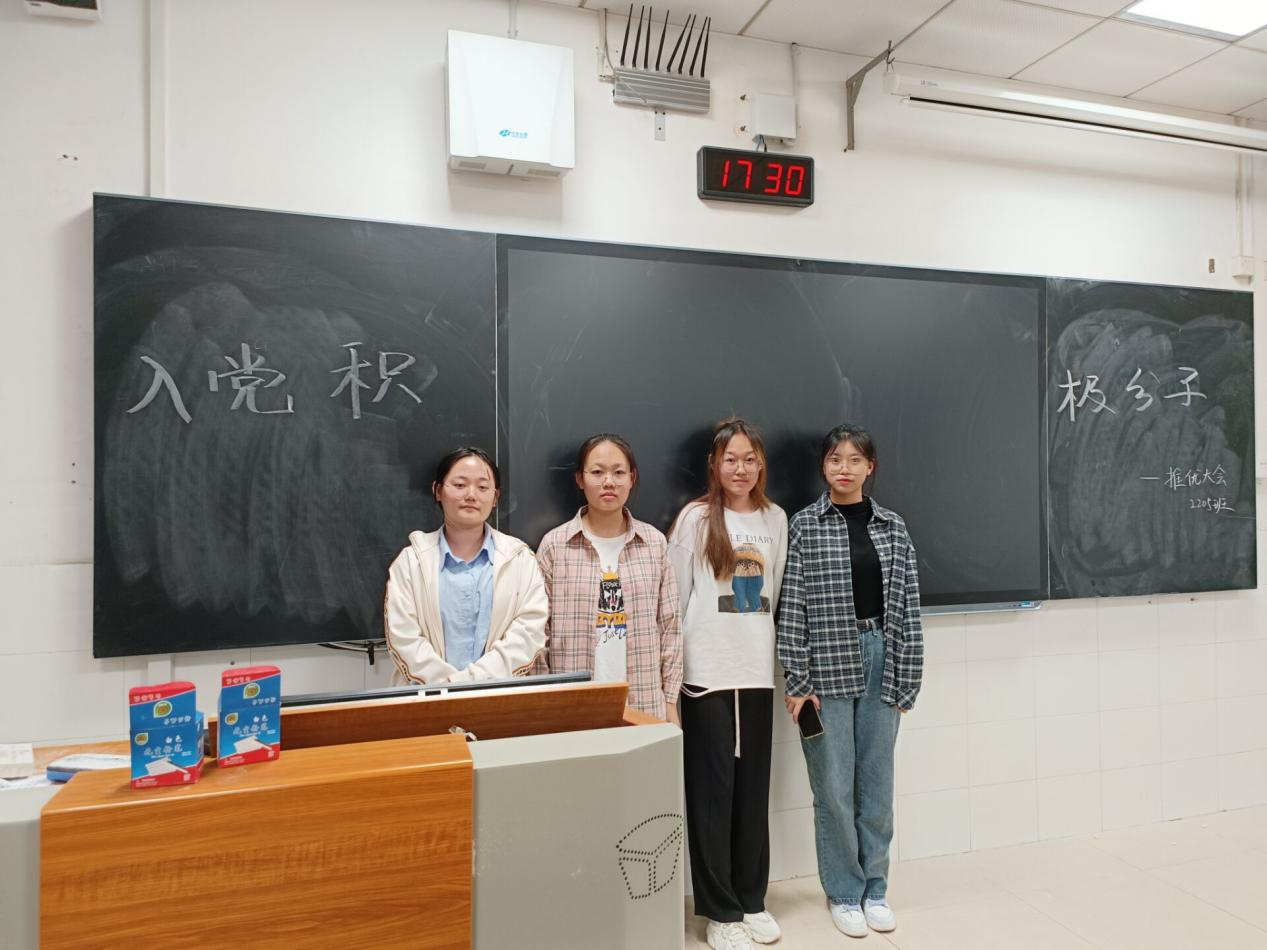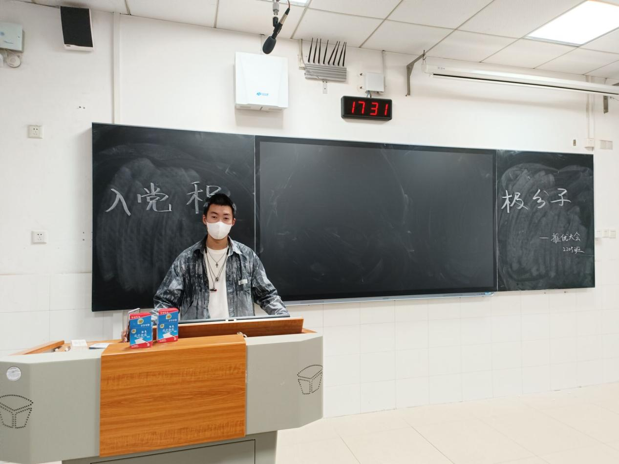 会议伊始,于子千从思想学习方面和社会工作方面介绍推优入党的作用和意义,并简要叙述活动的具体流程,并且简要介绍了候选人的基本情况。四位候选人孙佳琪、张远、李彤、常嘉雯相继上台,针对品德、学习情况、入党原因等方面进行自我叙述。候选人发言完毕后,2205班成员进行匿名投票。投票完毕后,于子千唱票并公布票数,四位候选人成功入选。