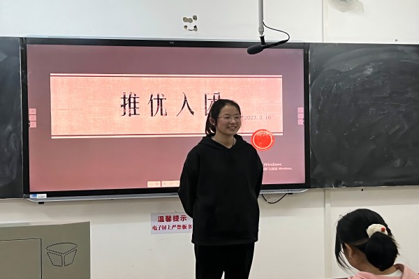 活动伊始,向妮进行简单的自我介绍,以为什么要加入问鼎团校为引进入正题。向妮提到身边党员对自己的影响,不论夏日酷热还是雷雨震震都能看到他们的身影,他们对居民工作深入了解熟练掌握。同时她提到大人物对自己的影响,无私奉献的雷锋,为人民服务的焦裕禄,一代伟人毛泽东,无一不留下了深刻印象。向妮还提到自己满足加入问鼎团校的要求,作为班委与同学相处融洽,作为干事工作认真负责,多次参加志愿活动和社会实践活动。