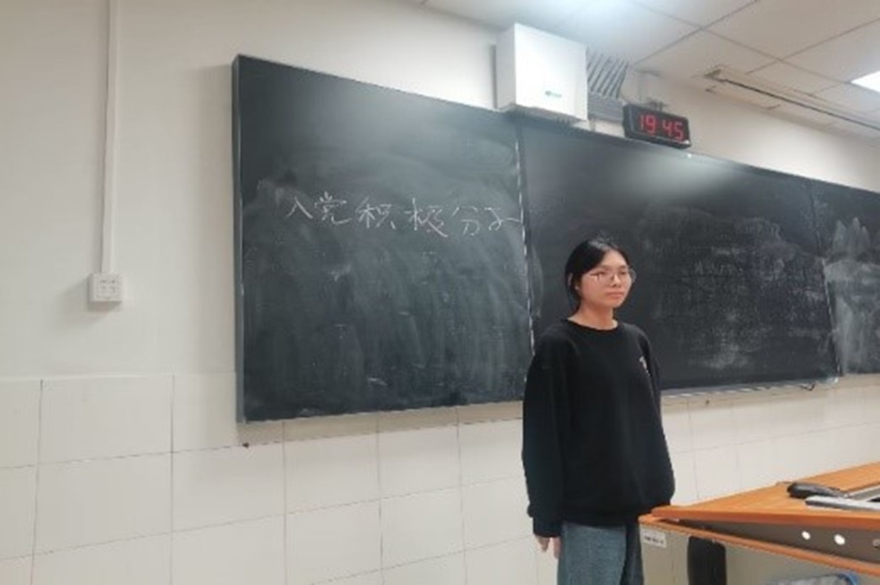会议伊始,化工院2002班班长周策简单介绍了会议流程、投票规则以及入党积极分子培训班的基本情况。由梁卫媛同学上台发言,讲述自己对中国共产党的认识也表明自己的思想状况和为什么要加入入党积极培训班,以及自己今后在思想政治方面学习的计划。梁卫媛提到她受到身边党员对自己深深的影响,不论多艰苦的环境,多困难的任务,他们都能扛起大旗,完成党的任务,服务人民。为人民服务的焦裕禄同志是她的偶像,一代伟人毛泽东是她的太阳。