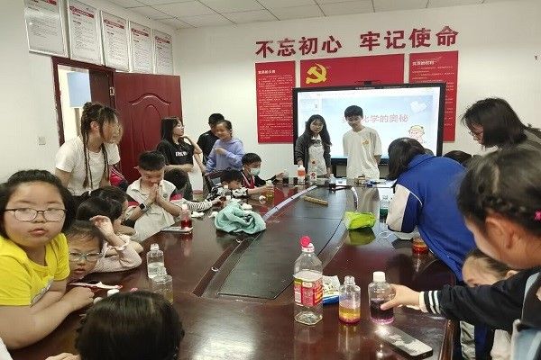 此次活动中,理事徐翔宇安排好各项事宜,和其他理事带领着志愿者,前往岳南村社区为小朋友们科普生活中有趣的化学知识。志愿者们以幻灯片演示和视频讲解的方式向孩子们介绍了各种各样的化学趣味知识,并且带领小朋友亲自动手做“熔岩灯”小实验和“化学红绿灯”小实验,美丽奇妙的实验现象让小朋友们体会到了化学的奥妙所在。活动最后,徐翔宇向小朋友们分发了可爱的小礼物。