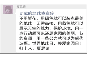 本次活动的圆满完成,离不开各个志愿者优秀的服务精神。在打卡期间,志愿者们积极发表自己对保护地球的见解与看法,宣传同时也收获相应的环保知识。本次活动不仅增强了各志愿者的服务意识,还丰富了课外生活,同时增进了2104班班级凝聚力。