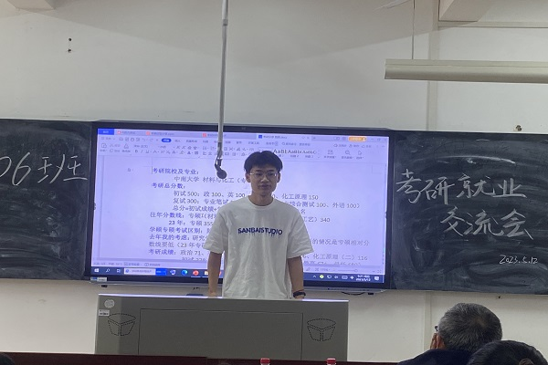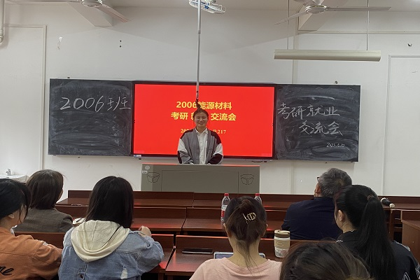 会议伊始,郑思佳上台介绍交流会开展目的,并依次邀请四位学长上台分享了个人的考研过程。学长们都认真地给同学们详细把握到每个细节,避免同学们走上任何弯路或错路。郑思佳对各位学长的考研与就业经验进行总结后,依次邀请了三位老师上台详述了考研的注意事项和往届能源材料方向的学长们的考研就业情况,对往届班级情况了解有助于同学们更好的根据自身选择适合自己的规划。郑思佳在会议最后对本次交流会作出总结,2006班全体员工对受邀分享经验的所有老师、学长表示衷心地感谢。