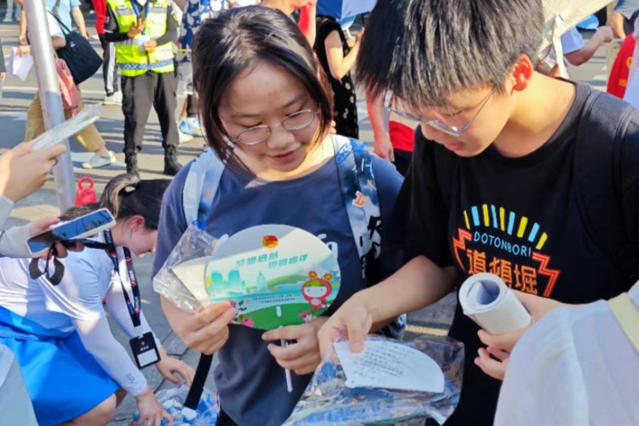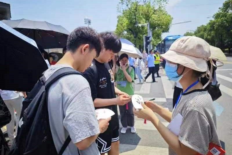 志愿者于6月6日中午在至善楼106教室提前制作了纸扇,有的在纸扇上自创祝福诗,有的画上卡通图画表达真诚祝愿,希望能缓解高考生紧张的心情、使其以平和的心态应对高考。志愿者分别在各科考试结束后,在英国365上市公司附属中学门前静待考生,进行纸扇赠送,为结束考试的考生们送上第一时间的祝福。考生收到纸扇时表示十分惊喜,并向志愿者们表达了感谢。