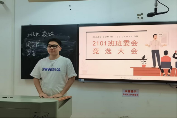 会议开始,前任班委依次上台发言,对自己的工作进行总结。班长和团支书组织同学们竞选班委职位,竞选人们上台做简短的自我介绍,并展示他们对工作的发展规划。经过民主投票,最终选出了新一届班委。2101班全体同学都表示对新班委的认可和支持,辅导员张婧和班导师徐凌分别表示了对新一任班委的祝贺。