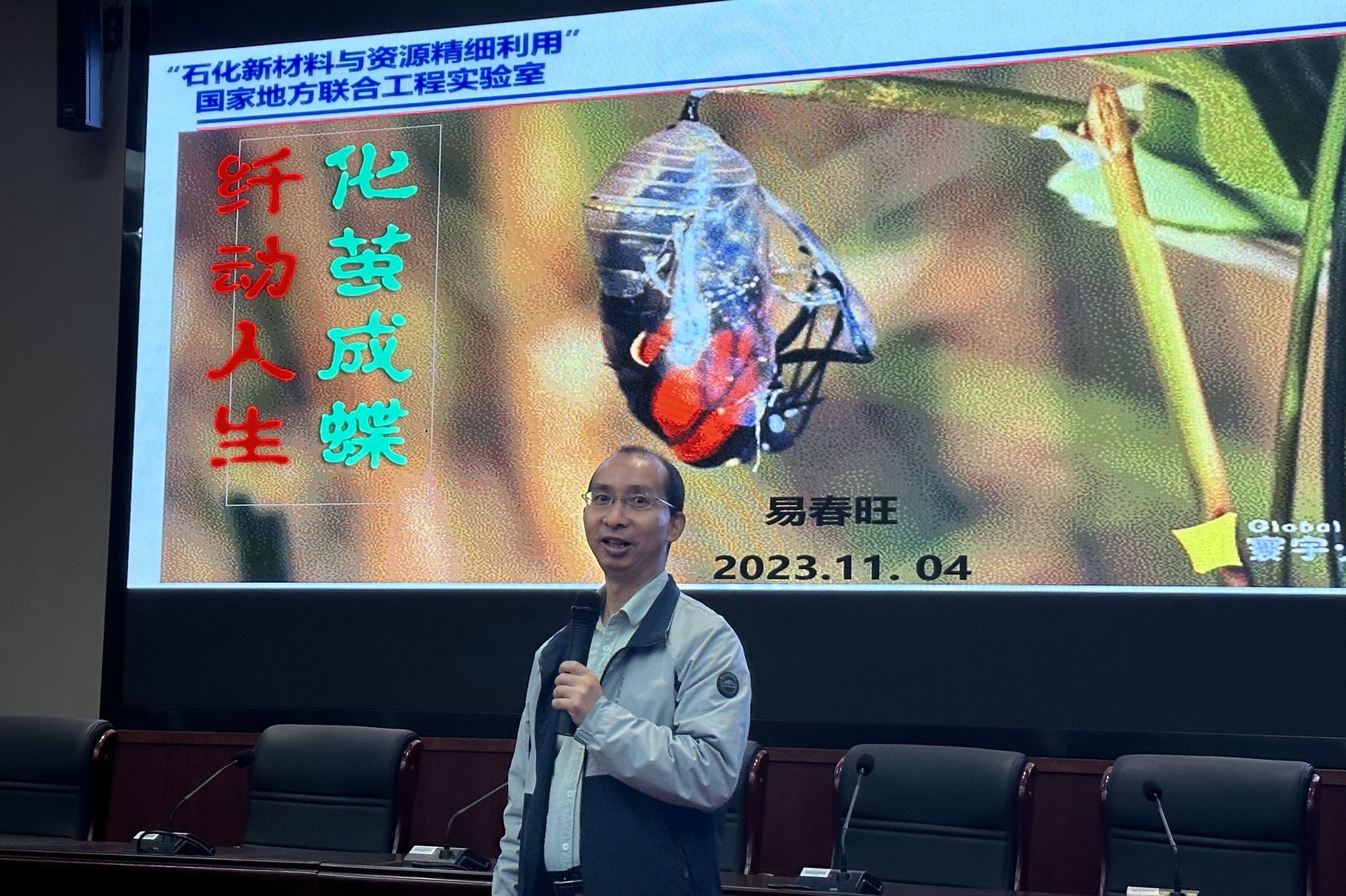 活动伊始,易春旺从自身经历和成就出发,用一张破茧成蝶的图片引出此次的主题“化茧成蝶,纤动人生”,切合主题而不落俗套。作为一个化教的专业生,从开始的不了解与不热爱,但依然选择坚持走有关聚酰胺研究的科研道路,易春旺挑战自我,勇于尝试,最终小有成就。