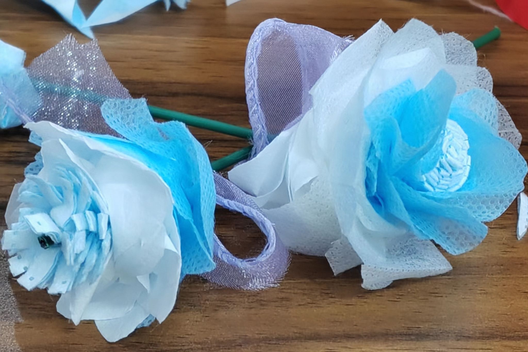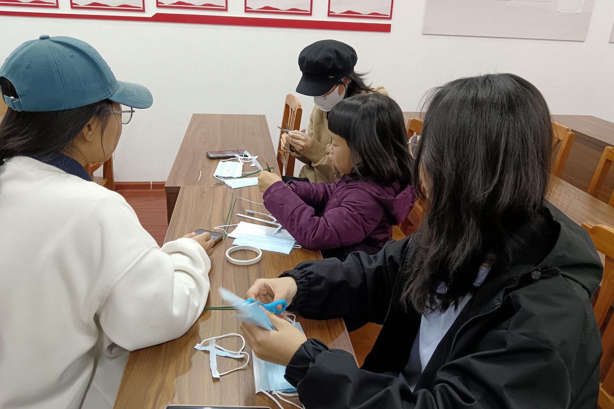 此次活动由绘心民俗社副理事长尹美娟主持,其余理事会成员负责活动准备和场地布置。在活动中,志愿者们积极参与,提前学习了制作教程。大家先将口罩展开,去掉边角,并按照1:2的比例将其修剪成花瓣状,每片花瓣按照不同颜色分类放置以达到渐变效果,同时取下口罩上方长条中的铁丝,剩余部分制成花蕊。待各项准备工作完成后,会员们用双面胶将花蕊、花瓣和花杆连接起来。除此之外,理事王燕用扭扭棒制作了各式各样的花朵,送给参加此次活动的志愿者与小朋友们。在活动最后,大家拿着自己的作品,一起在社区门口合照留念,记录下这愉快的时刻。
