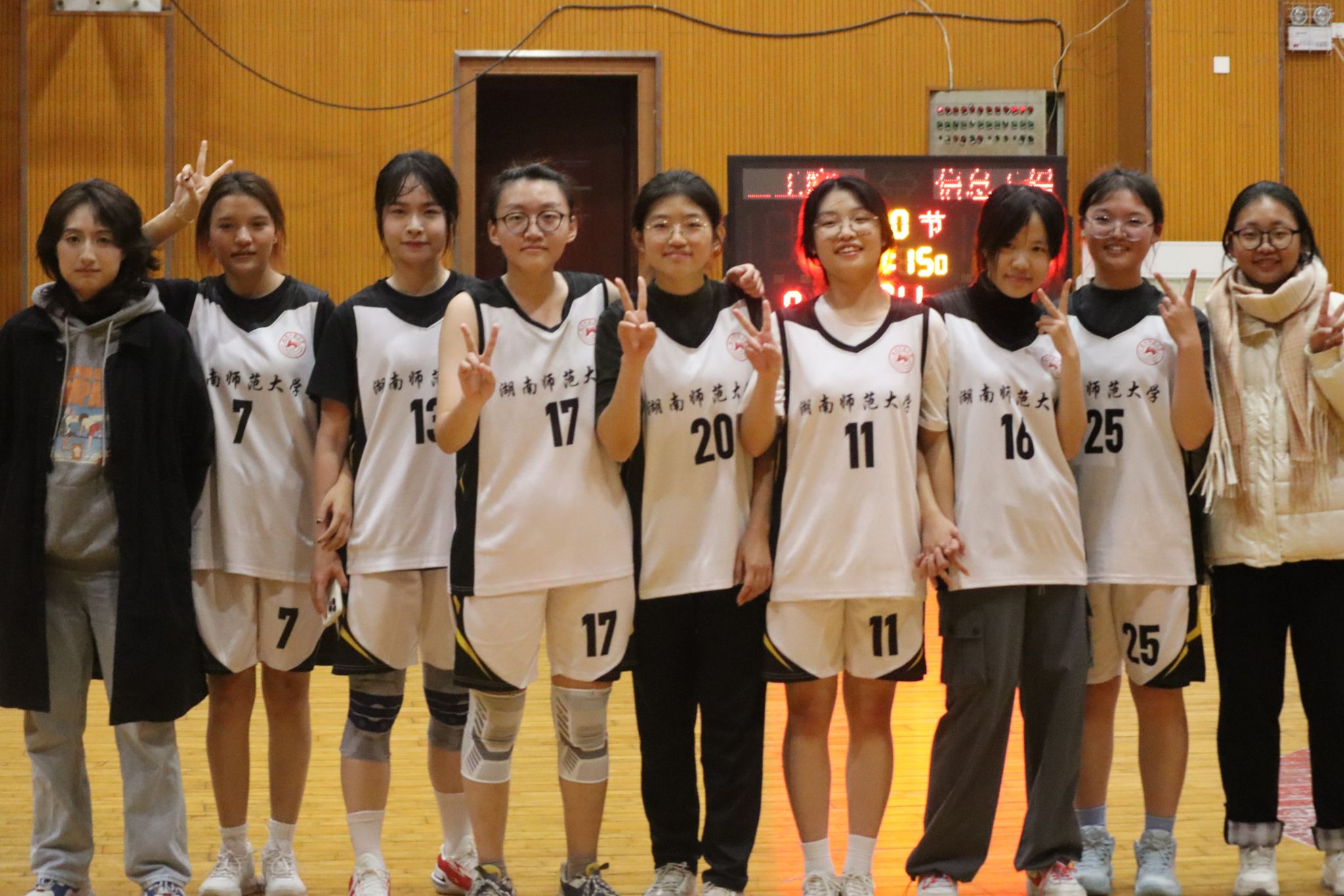 比赛结束后化工院女子篮球队队员着球服合影留念