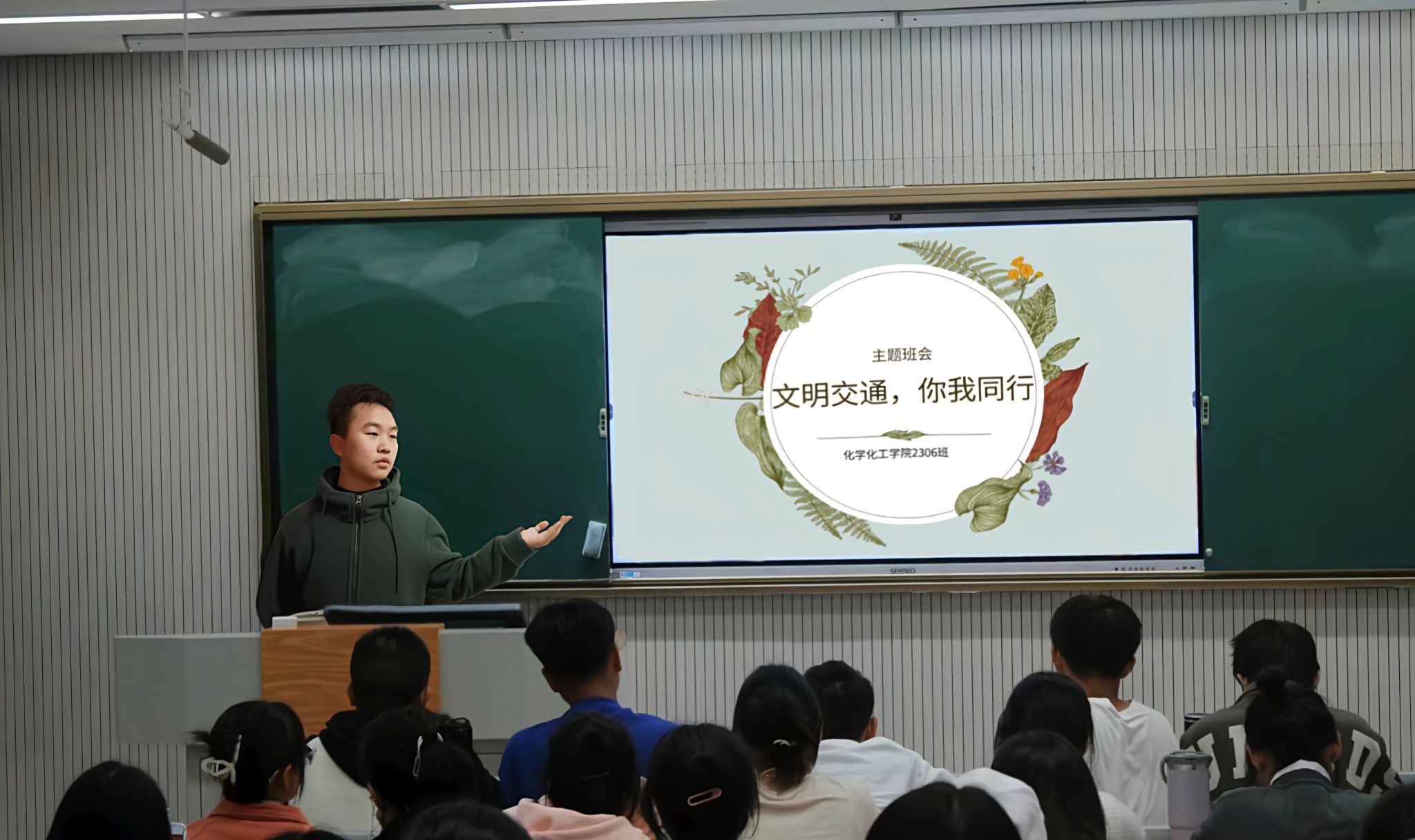 (通讯员 朱育林)11月29号12时10分,2306班在化工楼教室举行“文明交通,你我同行”主题班会活动。此次活动由2306学委朱育林主持。