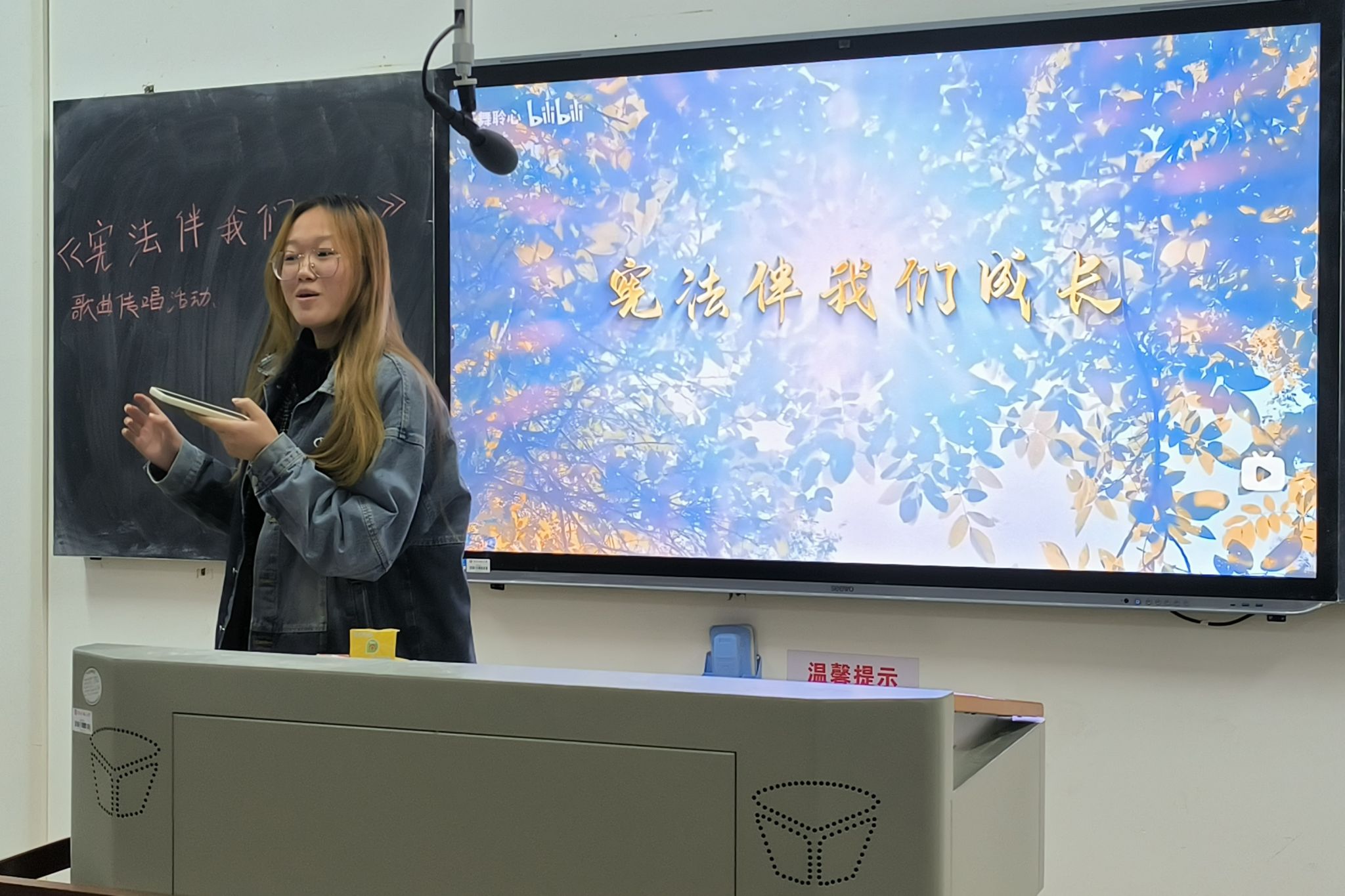 活动伊始,2208班全体同学全体学唱《宪法伴我们成长》,并在李彤的带领下齐唱《宪法伴我们成长》。随后,李彤从我国宪法的概念、性质、特征及其发展等多个方面介绍了宪法的有关知识,点明了宪法的重要意义——它是治国安邦的总章程,是党和人民意志的集中体现,具有最高的法律地位、法律权威、法律效力。活动最后,班级成员齐读宪法条例,更加深刻地领悟了宪法精神。