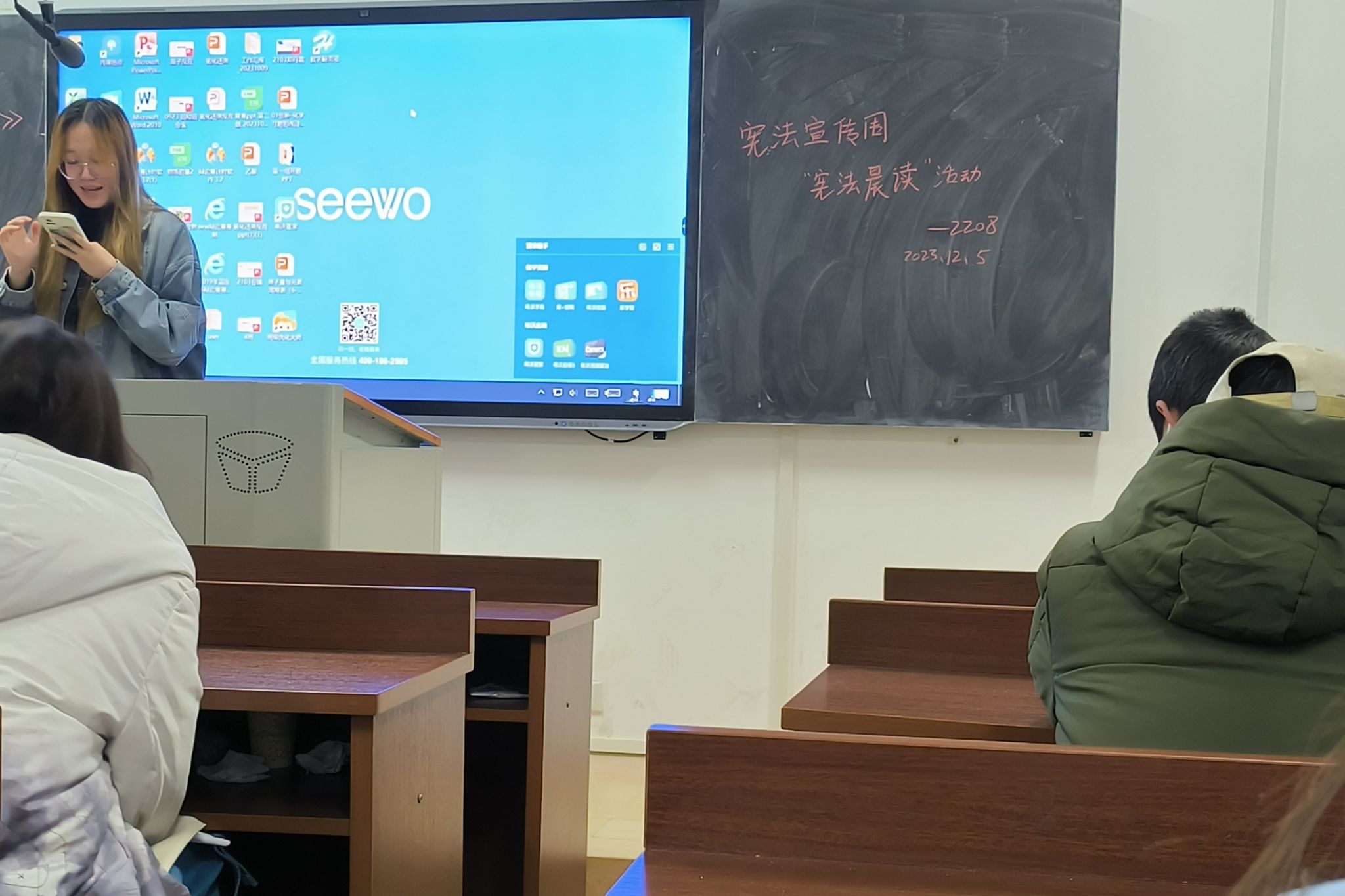 (通讯员王天一)12月4日上午8时,为学习宣传习近平法治思想,大力弘扬宪法精神,2208班团支部在化学楼217教室开展“宪法宣传周系列活动之宪法晨读活动”。此次活动主要目的是加大宪法宣传教育和普法力度,引导班团内部形成尊崇宪法、学习宪法、遵守宪法、维护宪法、运用宪法的良好氛围,为奋进新征程汇聚起强大法治力量。