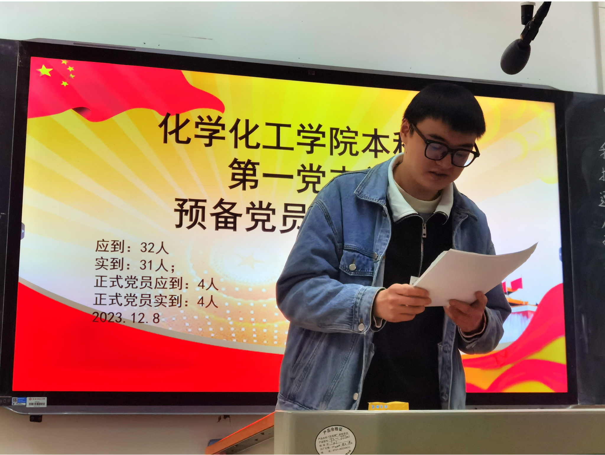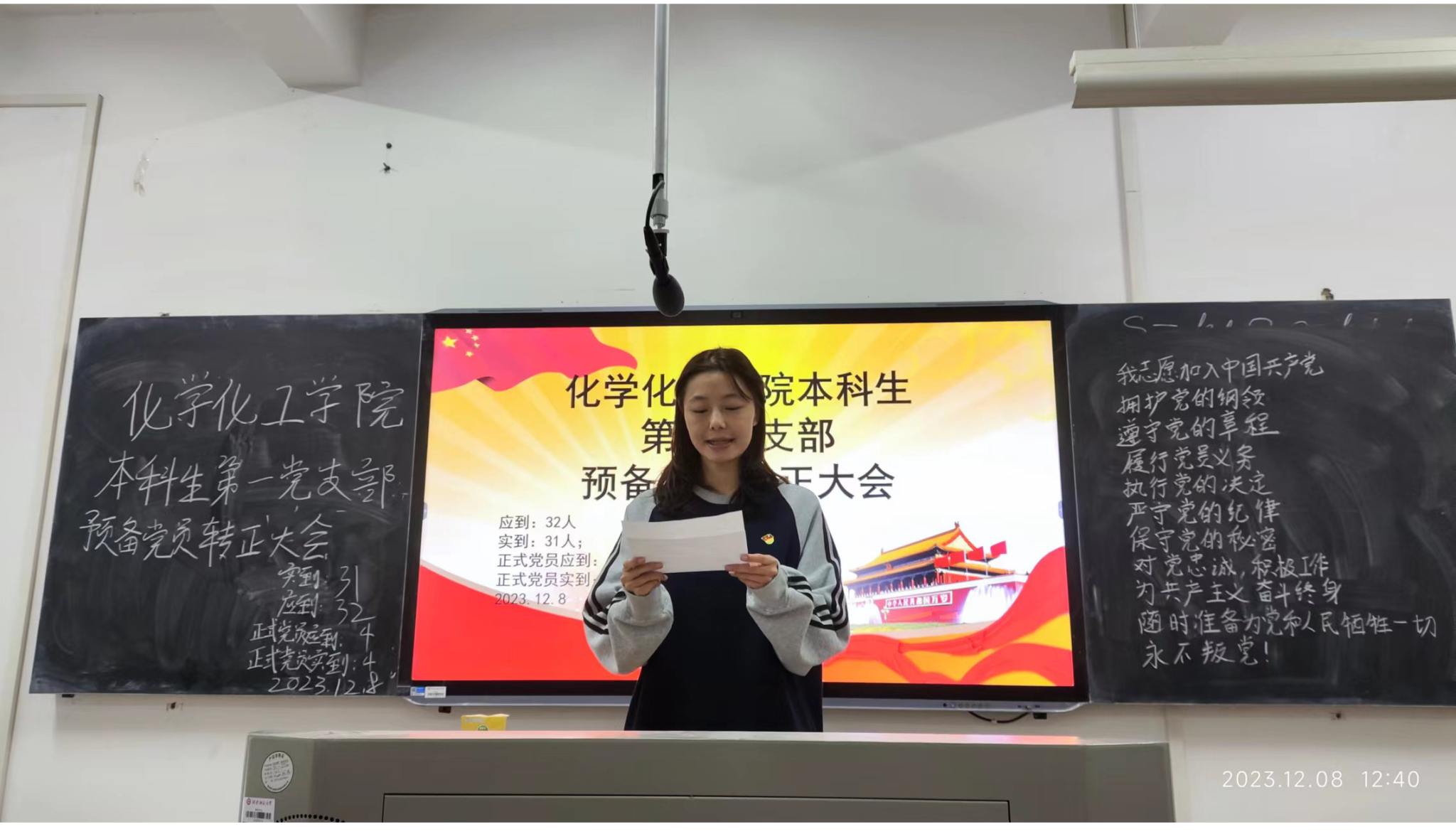 大会讨论了吴哲、王姝雅、邓星、吴碧雯、伊方园五位预备党员的转正问题。五位预备党员按顺序汇报自己在预备期间的各方面情况,正式向党支部提出转正申请。他们实事求是、客观认真地汇报自身的思想、学习、工作、生活方面的情况,并表示要加强党的理论的学习,遵守党的纪律,发扬党的优良传统和作风,充分发挥党员的先锋模范作用,为人民服务,成为合格的共产党员。邓书平同志介绍五位预备党员在预备期间的表现情况;梁乃文同志代表支部委员会报告五位预备党员在预备期间的审查意见。四位正式党员无记名投票表决,五位预备党员转为正式党员,全体同志面向党旗共同宣读入党誓词。