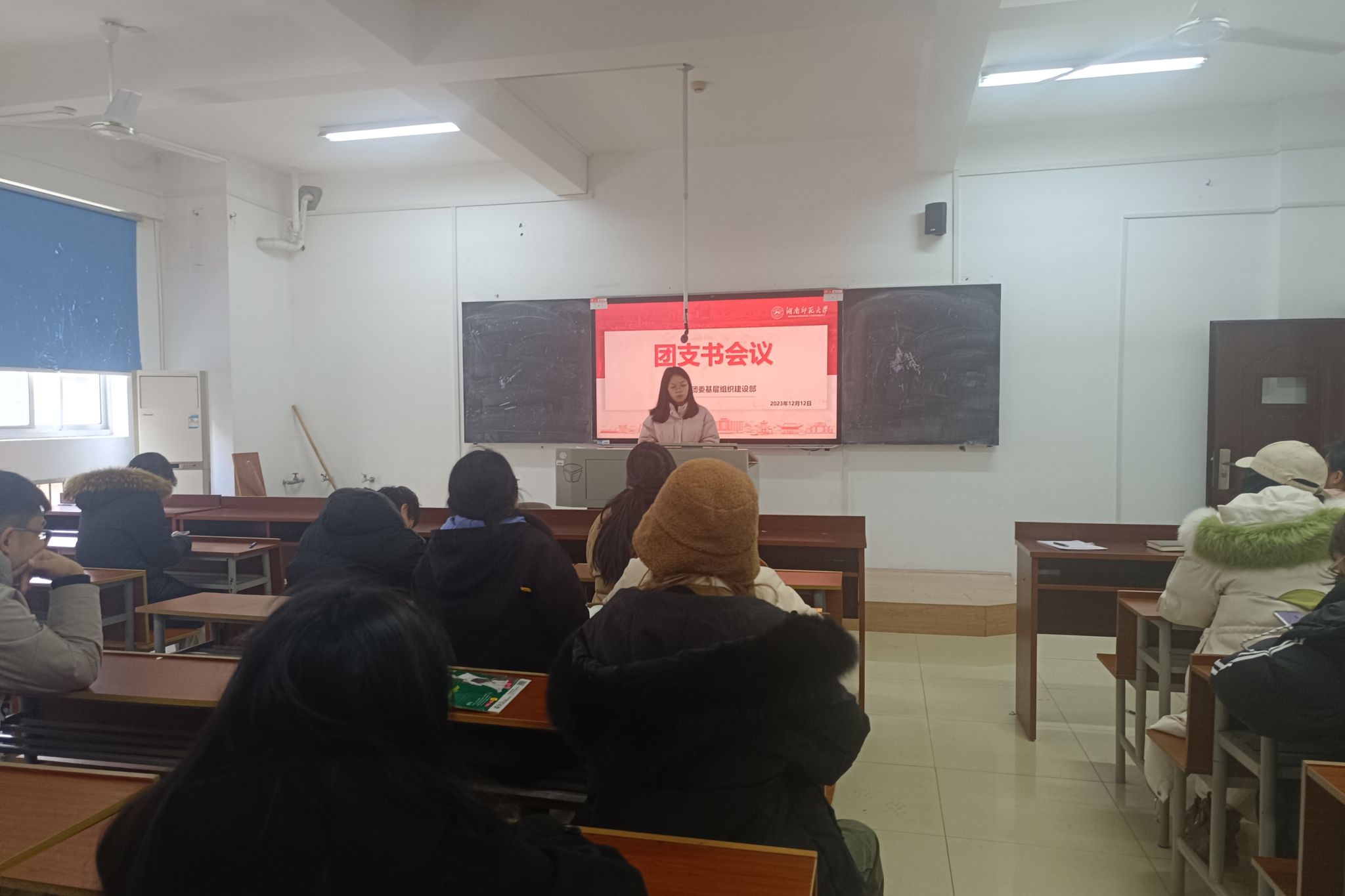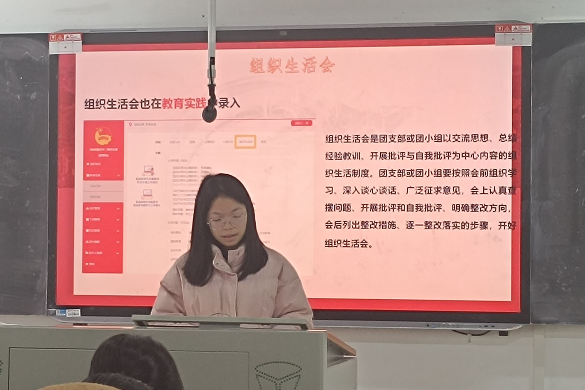 会议伊始,周佳对基建部日常负责的青年大学习和全院政治面貌收集两项工作进行介绍,对团支书提出了工作上的要求。为保障智慧团建系统中的工作有效开展,周佳向各班团支书详细介绍团日活动与团课,组织生活会,三会两制一课和对标定级相关工作的各项流程,以及如何在智慧团建系统中进行操作,并对如何开展三会介绍了一些范例,强化团支书在理论上的认知和对智慧团建操作的熟悉。会议中,周佳以提问的方式增强团支书对团员和青年主题教育的认识,并多次说明团员教育评议制度和对标定级工作对个人和团支部的重要性,各班团支书要认真开展各项工作。