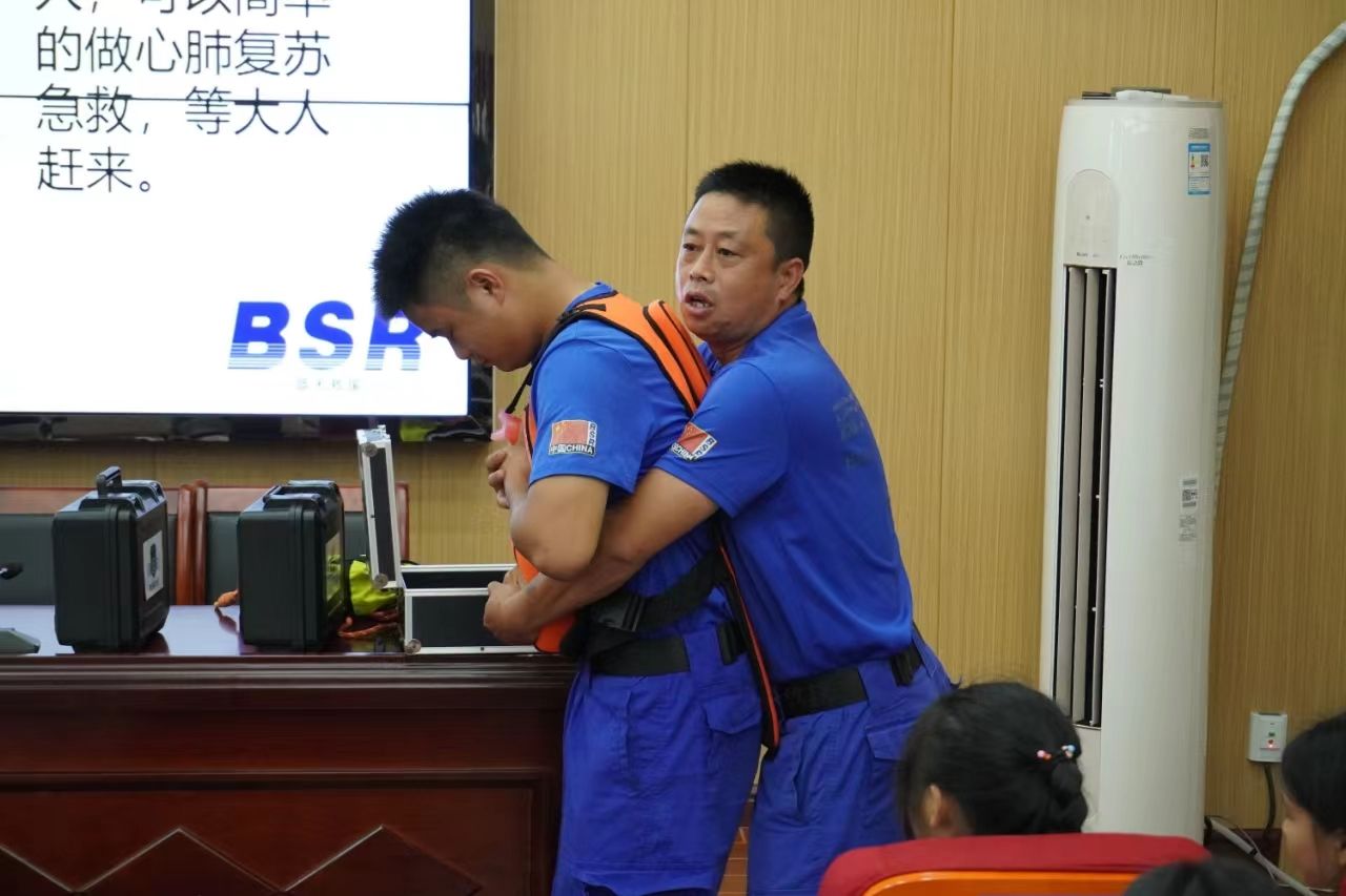 “麓山青年”暑期实践队队员和蓝天救援队队员通过播放溺水案例,从身边的事故切入,提醒同学们防溺水的重要性,并阐明了少年儿童溺水的严重危害性。讲解员通过列举各种危险行为向同学们敲响了警钟,同时也普及了几种常用的应急处理措施。蓝天救援队队员展示了发生溺水事故应如何进行救护,演示了心肺复苏的步骤,强调了心肺复苏适用情况和注意事项并与现场的师生们进行了互动演练。同学们对此感触颇深,安全防范意识和风险应对能力都得到了增强。