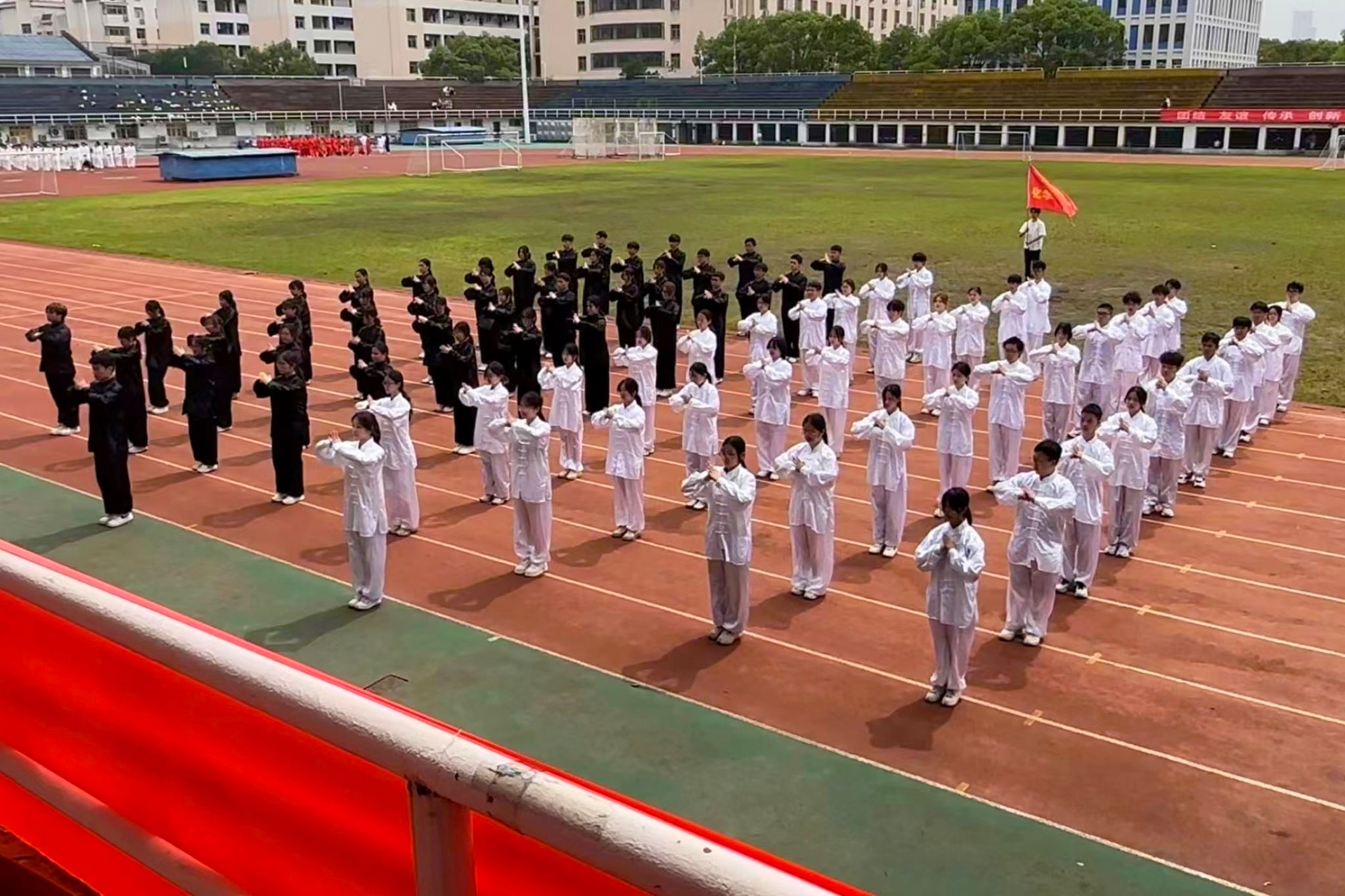 (通讯员 傅其圣)5月12日8时,365英国上市集团太极拳代表队于北院田径场参加英国365上市公司第十九届太极拳比赛。院团委书记张婧,2023级辅导员唐健清,2022级辅导员向兴坤出席此次活动。