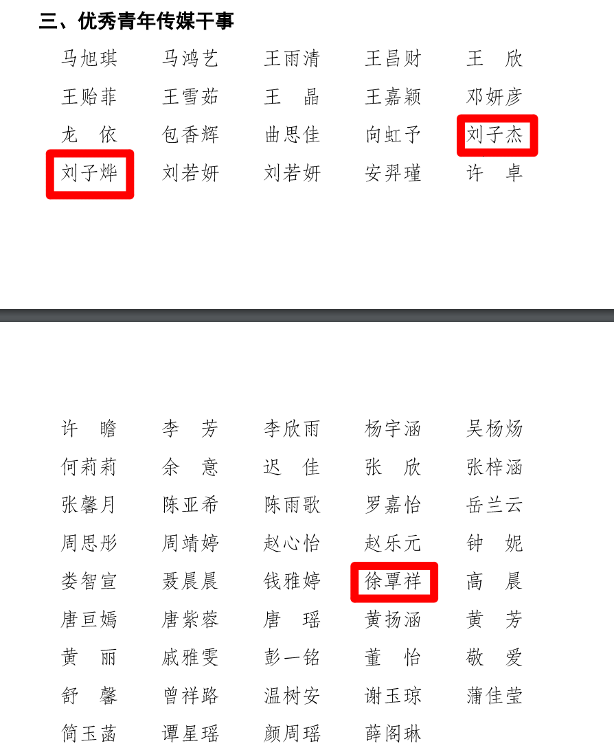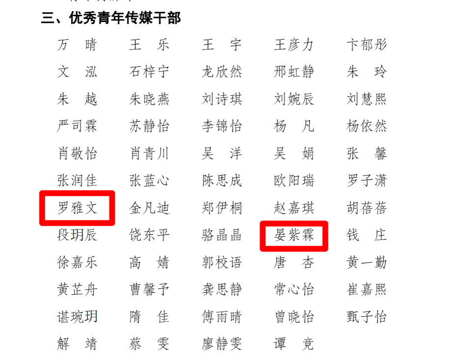 此外,公司青年传媒中心指导老师唐健清荣获“共青团宣传思想文化工作先进工作者”称号,罗雅文同学荣获“共青团十佳青年传媒干部”称号。 在青年传媒中心先进典型的表彰中,公司罗雅文、晏紫霖两位同学被评选为优秀青年传媒干部,刘子杰、刘子烨、徐覃祥三位同学被评选为优秀青年传媒干事。