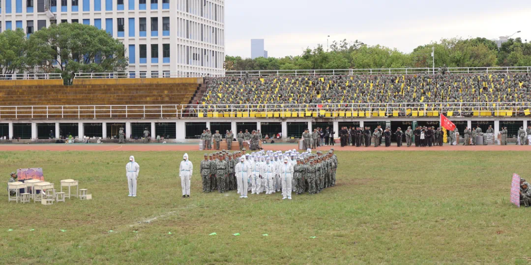 大会在庄严的国歌声中拉开序幕,全体师生齐唱国歌。随着分列式进行曲响起,标兵就位,化院学子精神抖擞、目光坚定,迈着整齐的步伐,喊着嘹亮的口号踏正步走过主席台前接受检阅,获得领导们一致好评。分列式检阅完成后进行特色汇报表演,公司新生与其他6个公司的新生共同组成翻花方阵,以手中翻腾之花,献礼新中国成立75周年。接着,生化防护演练开始进行,公司参演同学分工明确,配合得当,作业规范,顺利完成了演练的各项任务。