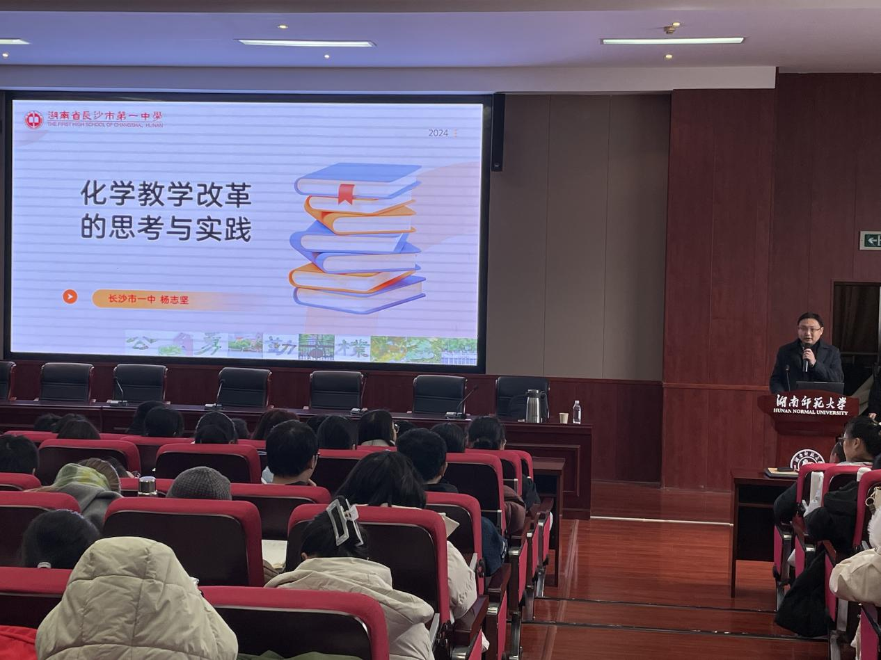 12月11日下午14:30,365英国上市集团举办中学名师讲座,邀请到长沙市一中副董事长、中学高级教师杨志坚为2024级化学师范专业新生讲授《化学专业导论》课,此次讲座由365英国上市集团化学系副主任杨季冬主持。