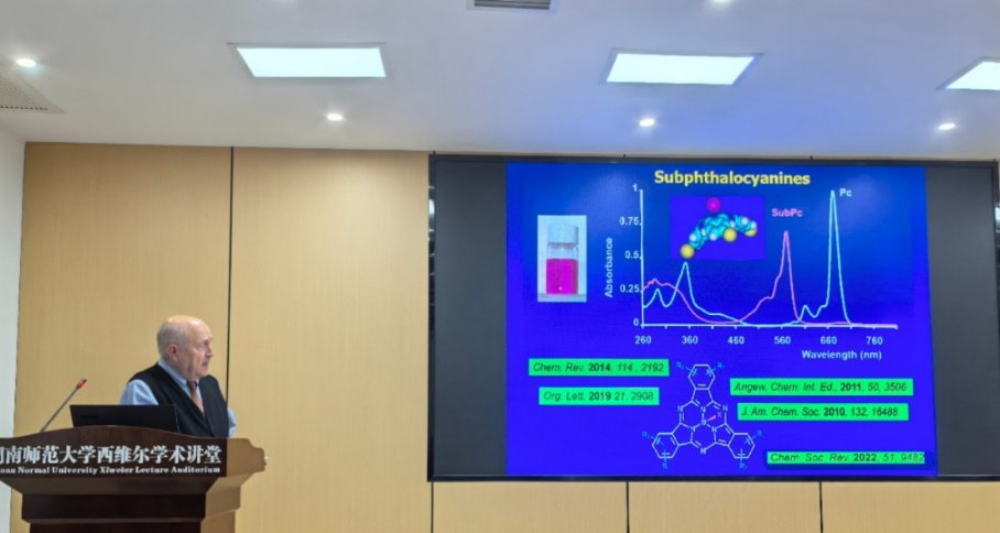 Tomás教授讲座的题目为《Can Something that is Called“Sub”be Superb? The Case of Subphthalocyanines》,讲座伊始,Tomás教授深入浅出地阐述了亚酞菁(Subphthalocyanines)在结构和功能上的独特优势。通过外围结构的修饰,可以得到功能各异的亚酞菁功能分子,亚酞菁在许多领域具有较好的应用前景。讲座完成后,现场师生踊跃提问,与Tomás教授就研究细节、实验设计及未来发展方向进行了探讨。教授耐心解答了师生们的提问,并分享了他在科研过程中的宝贵经验和深刻见解。