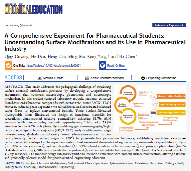 此次论文的发表,是公司教师陈波教授和杨蓉副教授第二次在该期刊发表教学改革类研究成果,进一步彰显了公司在推动科研反哺教学、提升本科教学质量方面的持续努力和显著成效,为国内外制药工程及相关专业的实验教学改革提供了有益的借鉴。其核心亮点主要体现在以下三个方面。一是创新技术与实践教学相结合。在该研究中,教师们创新性地将自主研发的“盐诱导相分离-疏水纸过滤”(Salt-Induced Phase Separation-Hydrophobic Paper Filtration, SIPS-HPF)技术成功应用于本科生的实验教学中,既丰富了实验教学内容,又体现了实验的先进性和挑战性,还为员工提供了实践机会。二是微观过程与可视教学相结合。在该研究中,教师团队将抽象的“表面改性”这一微观概念具体化、可视化,极大地增强了员工对相关原理的掌握和理解,帮助他们建立起宏观现象与微观结构之间的联系,有效突破了传统教学中对微观过程讲解的瓶颈。三是实验研究与应用教学相结合。在该研究中,员工以中药黄芩中活性成分黄芩素的提取、分离和富集为主线,独立自主完成与实际应用紧密结合的应用体验。