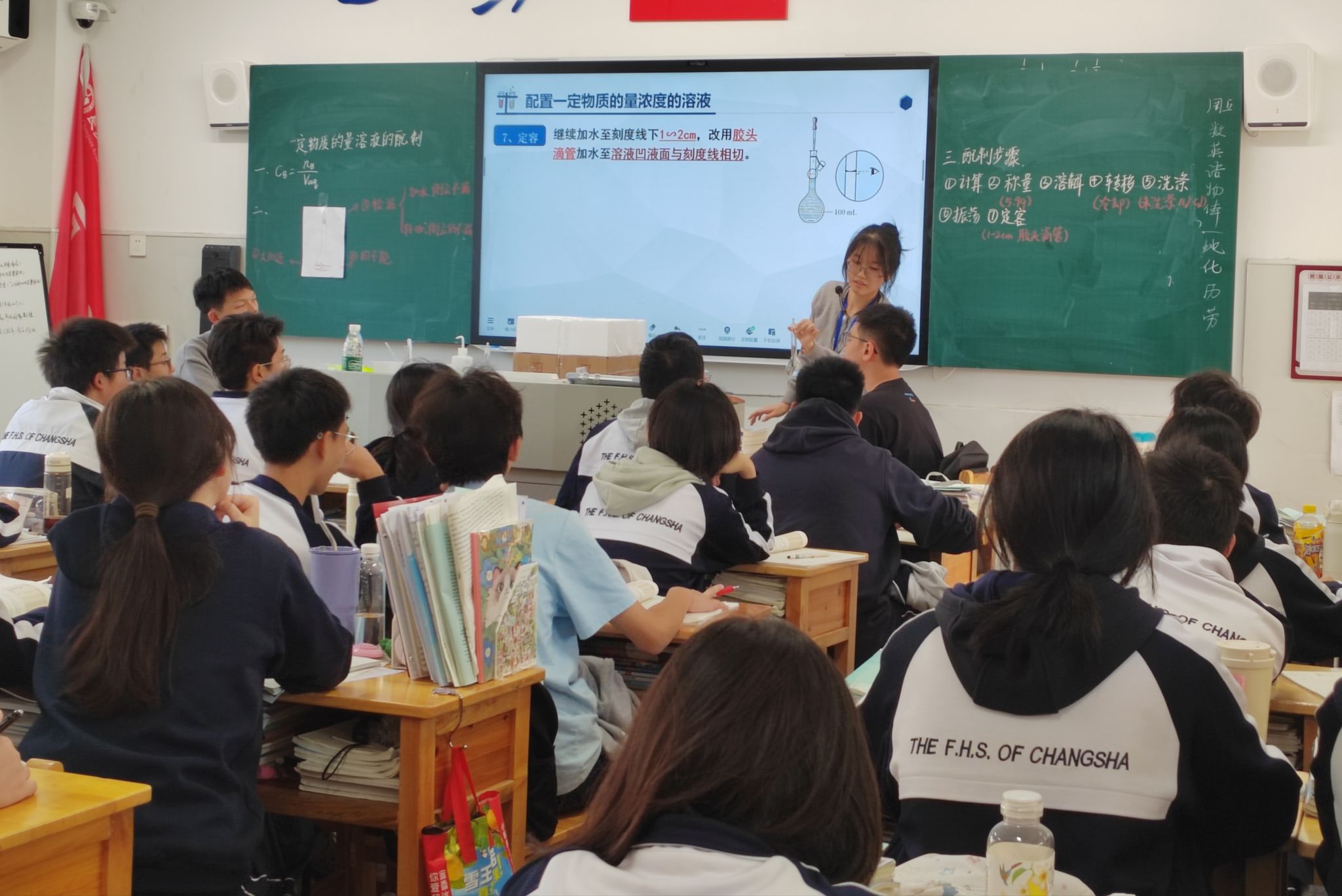 此次汇报课由实习队代表尹美娟主讲《配制一定物质的量浓度的溶液》,她以相关旧知及生活情境为切入点,详细介绍容量瓶构造与使用注意事项,向员工们展示溶液配制全过程。她还注重问题驱动化,用问题带动同学思考,整堂课重难点突出,师生互动积极。